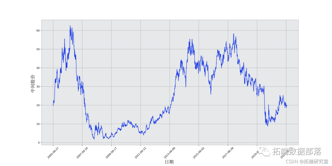 这张图已经说明了很多问题。我选择这家公司而不是其他公司的原因是,这张图随着时间的推移,股票价格有不同表现行为。这将使模型学习更加稳健,并且给你一个价格变化来测试对各种情况的预测有多好。