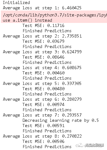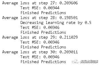 你可以看到MSE损失是如何随着训练量的增加而下降的。这是一个好兆头,表明模型正在学习一些有用的东西。你可以将网络的MSE损失与你做标准平均时得到的MSE损失(0.004)进行比较。你可以看到,LSTM比标准平均法做得更好。而且你知道,标准平均法(虽然不完美)合理地遵循了真实的股票价格变动。