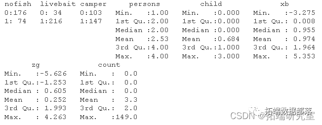 我们有 250 个去公园的团体的数据(查看文末了解数据获取方式)。每个小组都被询问他们捕获了多少鱼(count