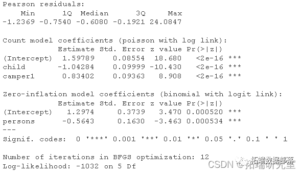 零膨胀泊松回归用于对超过零计数的计数数据进行建模。此外,理论表明,多余的零点是通过与计数值不同的过程生成的,并且可以独立地对多余的零点进行建模。因此,zip模型有两个部分,泊松计数模型和用于预测多余零点的 logit 模型(点击文末“阅读原文”获取完整代码数据)。