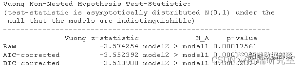 Vuong 检验将零膨胀模型与普通泊松回归模型进行比较。在这个例子中,我们可以看到我们的检验统计量是显着的,表明零膨胀模型优于标准泊松模型。