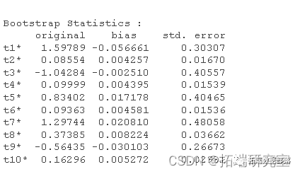 结果是交替的参数估计和标准误差。也就是说,第一行具有我们模型的第一个参数估计值。第二个具有第一个参数的标准误差。第三列包含自举的标准误差。