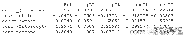 我们可以使用自举获得参数和指数参数的置信区间。对于泊松模型,这些将是事件风险比,对于零通胀模型,优势比。此外,对于最终结果,可能希望增加重复次数以帮助确保结果稳定。
