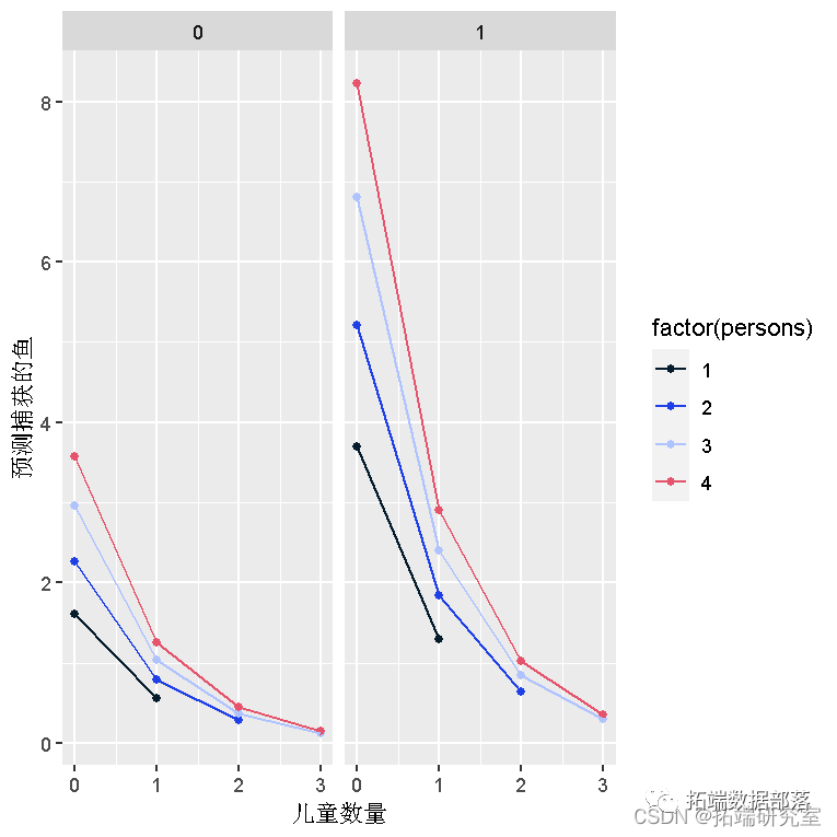 示例 。野生动物生物学家想要模拟公园的渔民捕获了多少鱼。游客会被问到他们逗留了多长时间,团队中有多少人,团队中是否有儿童以及捕获了多少鱼。一些游客不钓鱼,但没有关于一个人是否钓鱼的数据。一些钓鱼的游客没有钓到任何鱼,因此数据中存在多余的零,因为人们没有钓鱼。