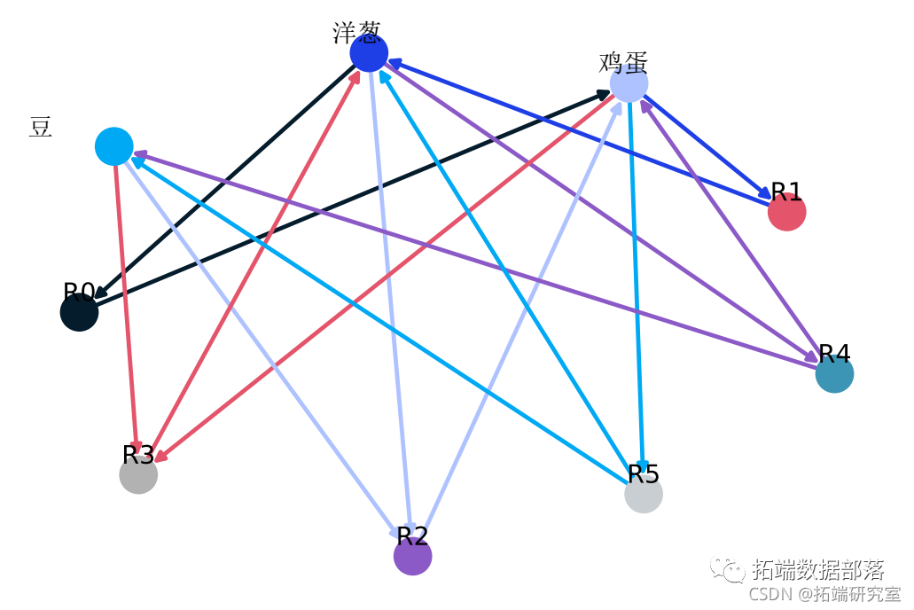 为了将关联规则表示为图。这是关联规则示例:(豆,洋葱)==>(鸡蛋)