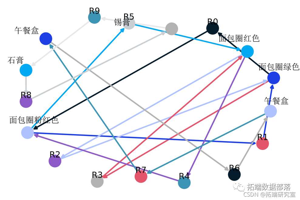 下面的有向图是为此规则构建的,如下所示。具有 R0 的节点标识一个规则,并且它总是具有传入和传出边。传入边将代表规则前项,箭头在节点旁边。