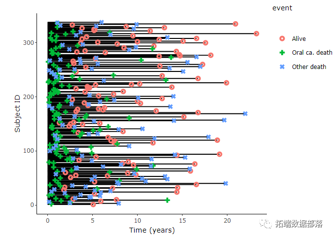 =结束随访的事件(因子):1 =正常,2 =口腔癌死亡, 3 =其他原因造成的死亡。