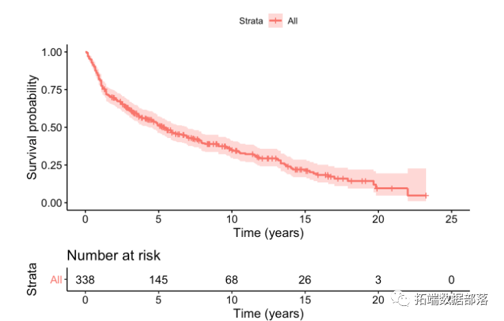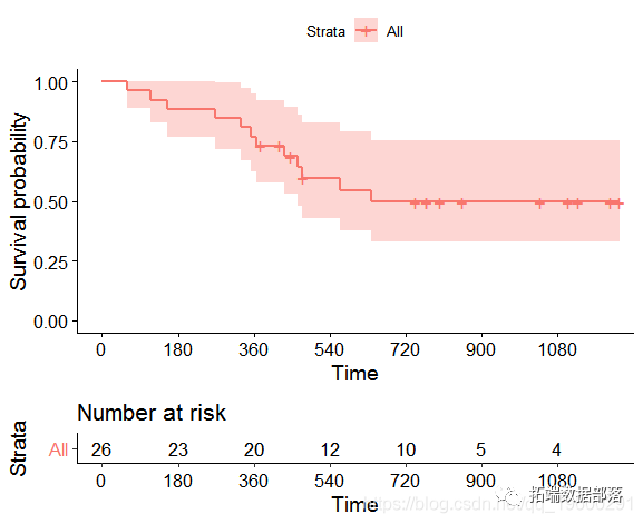 生存曲线基于每个死亡时间的风险数量和事件数量。包的survfit()