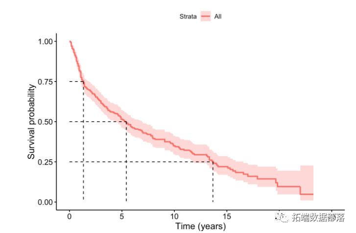 可以从估计的生存曲线导出诸如分位数的集中趋势的度量。