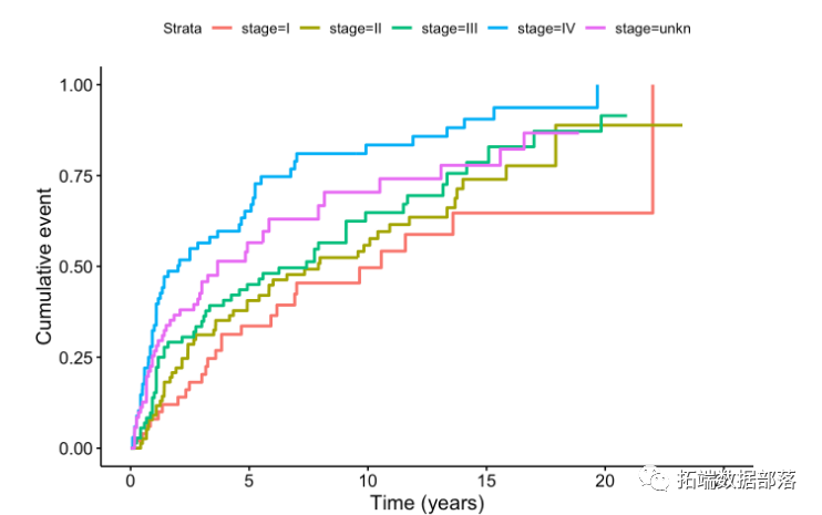 我们可以看到,IV期口腔癌死亡的CIF高于III,甚至更高于I + II。相反,对于其他原因死亡率,曲线似乎不随肿瘤阶段而变化。