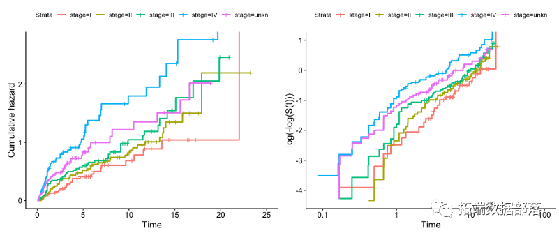 =肿瘤的TNM分期(因子):1 =“I”,..., 4 =“IV”,5 =“unkn” time