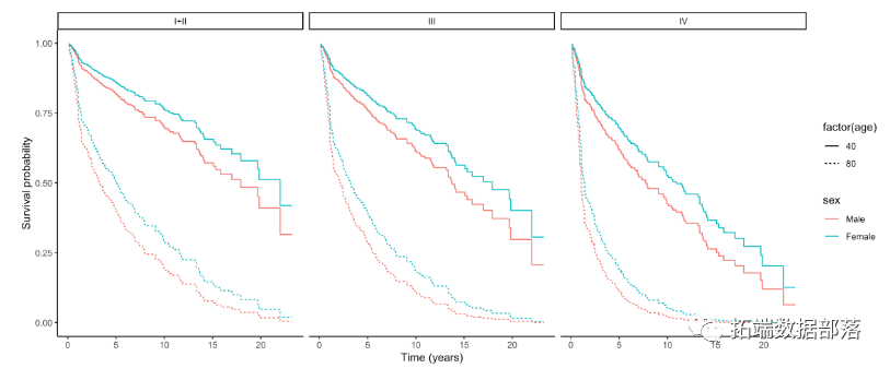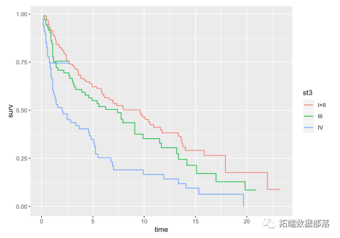 该信息可以直观地比较在肿瘤阶段的水平上分别估计的生存曲线。