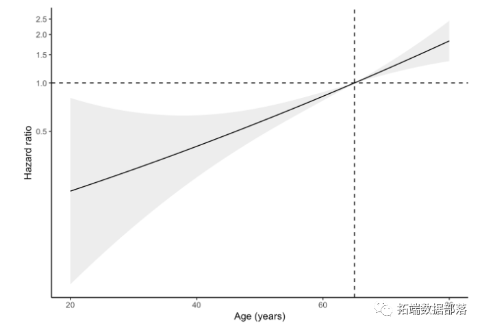 I((age - 65)/10) 0.2814 1.325 0.093 3.024 2.5e-03