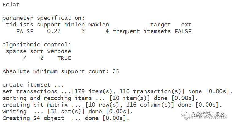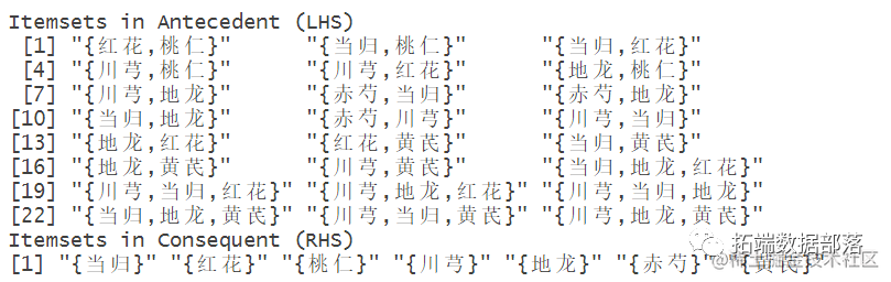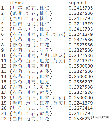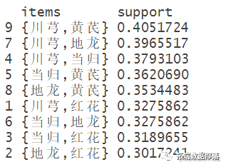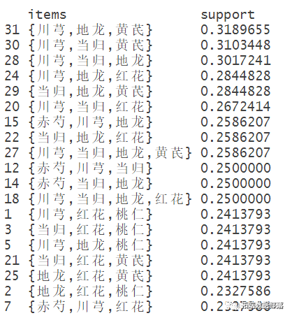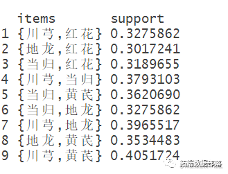 根据支持度对求得的频繁项集排序并查看(等价于inspect(sort(frequentsets)[1:10])。