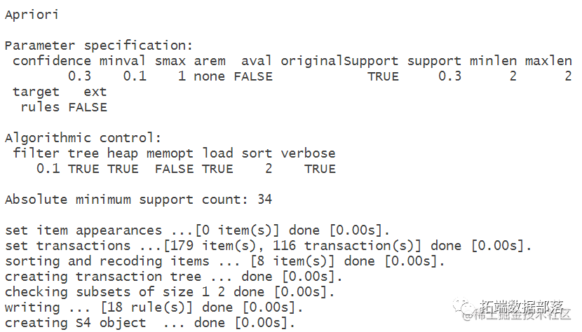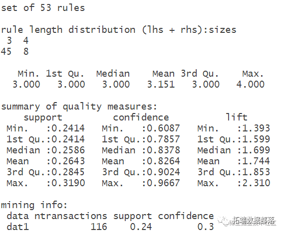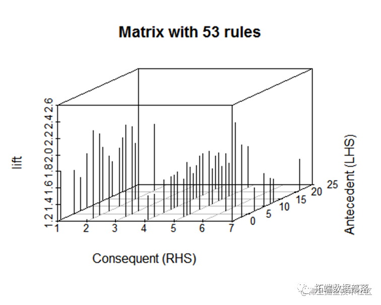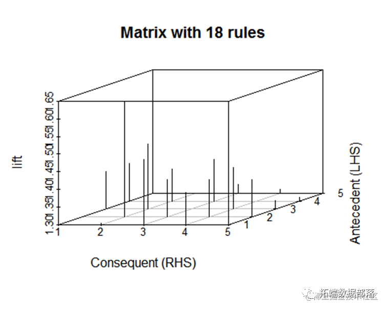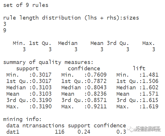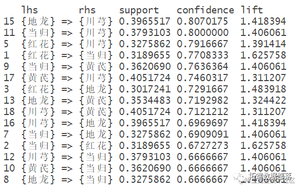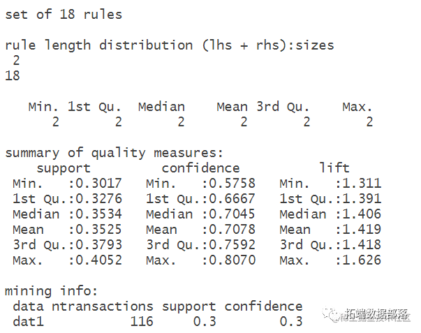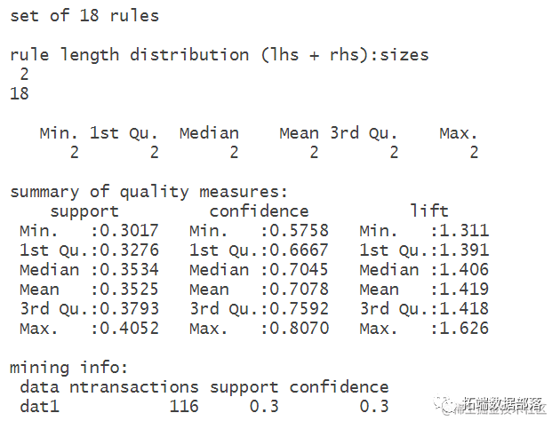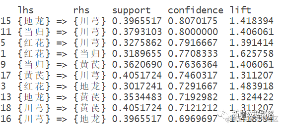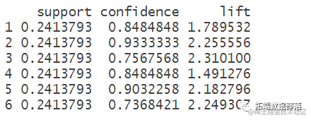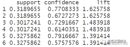 confidence>0.3 & support>0.3 & lift>=1) #得到有价值规则子集