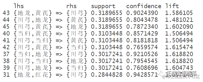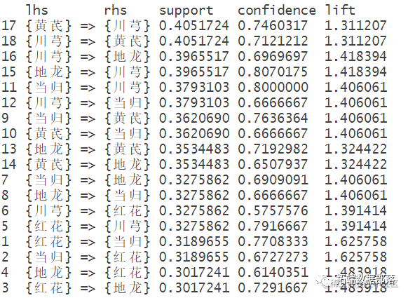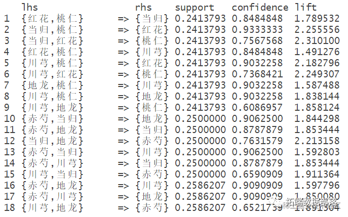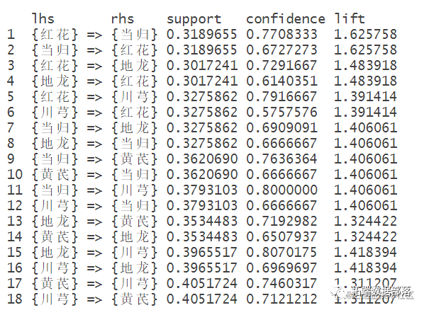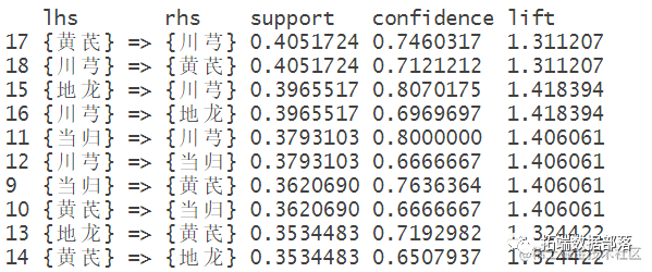 ## 37 {当归,地龙} => {川芎} 0.3017241 0.9210526 1.618820