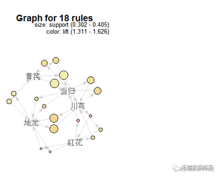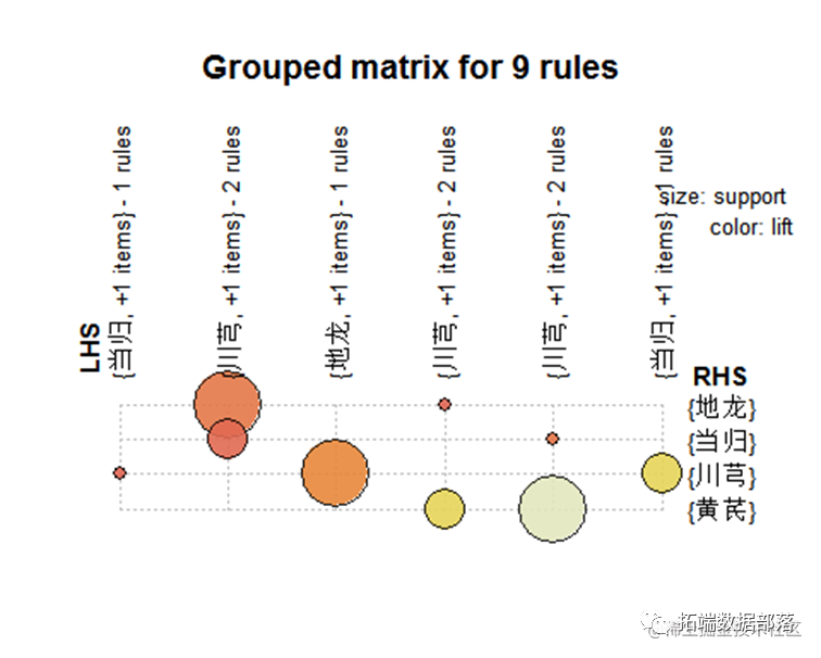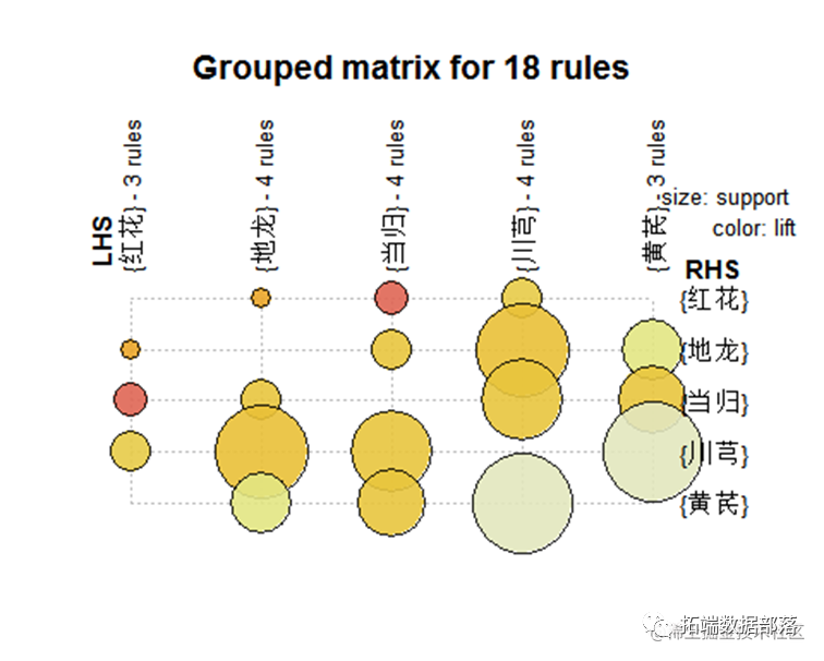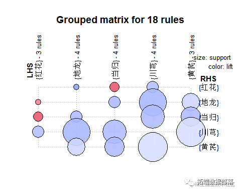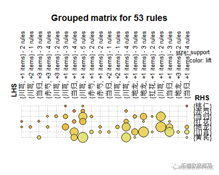 通过该图可以看到规则前项和规则后项分别有哪些物品 以及每个物品的支持度大小,支持度越大则圆圈越大。