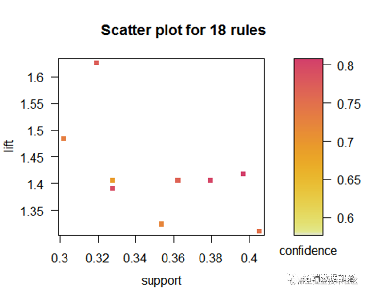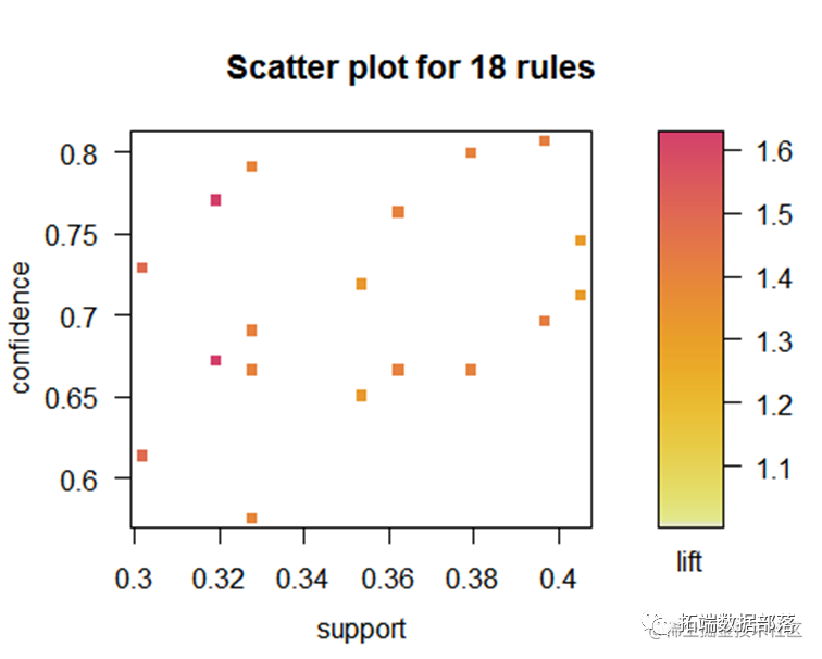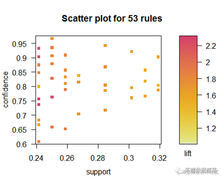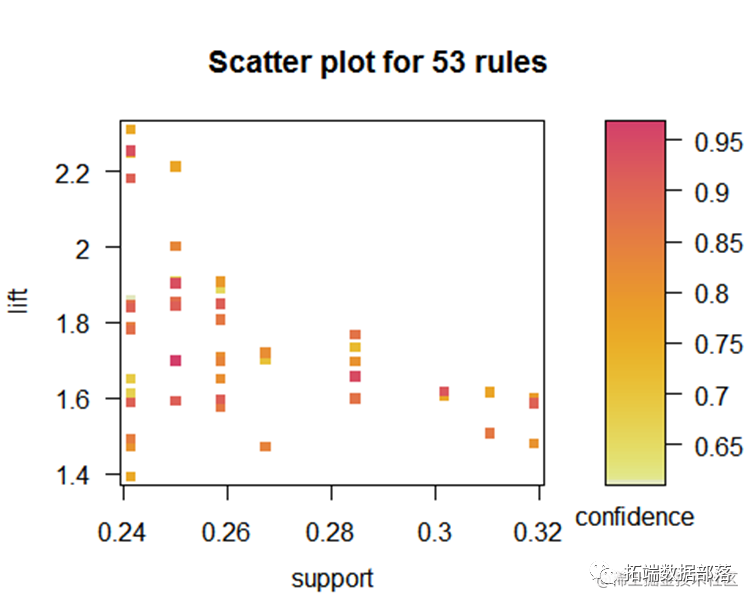 从该图可以看到支持度和置信度的关系,提升度越高置信度也越高。
