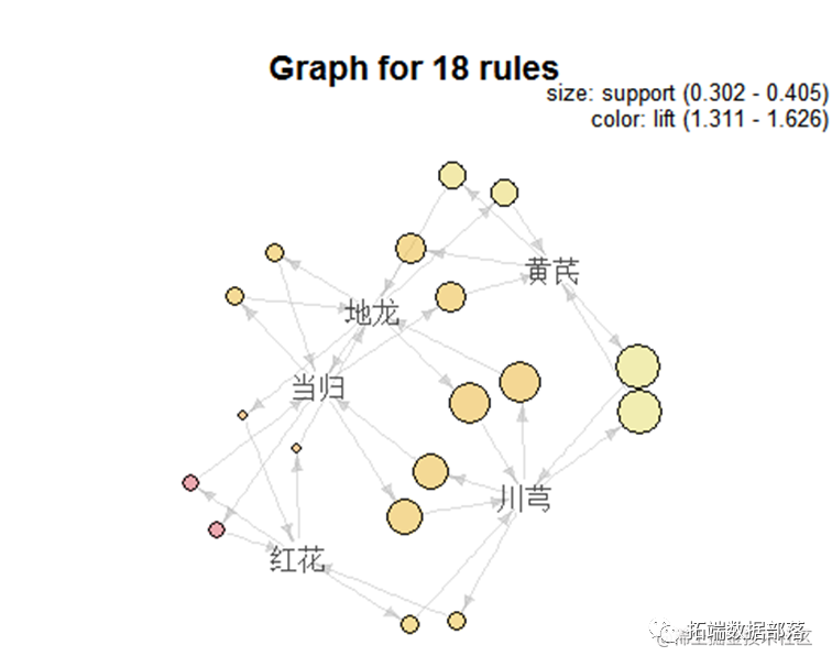 从上图可以看到不同物品之间的关联关系,图中的点越大说明该物品的支持度越高,颜色越深说明该物品的提升度越高。