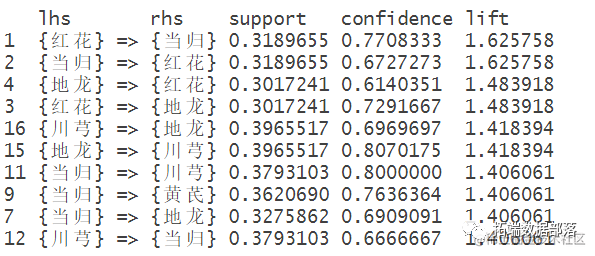 ## 41 {川芎,当归} => {黄芪} 0.3103448 0.8181818 1.506494