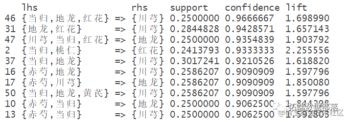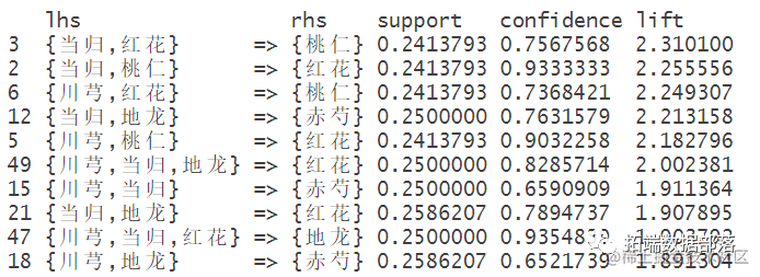 ## 42 {川芎,黄芪} => {当归} 0.3103448 0.7659574 1.615474