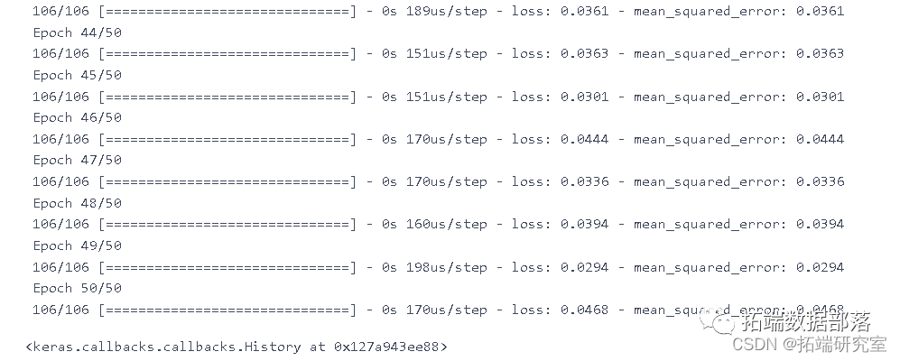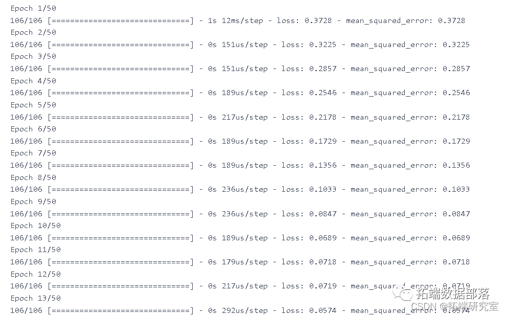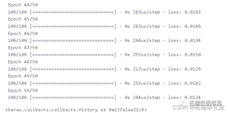 model.fit(X\_trn y\_rin, epochs=50, batch_size=200)