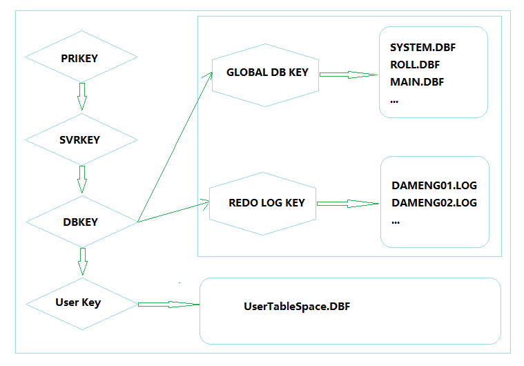 达梦使用多级密钥管理方式保证数据库密钥的安全性。达梦安装时通过RSA生成1024位的公私钥对,用公钥加密叫做SVRKEY的服务器主密钥,私钥PRIKEY被单独加密存储在本地文件中。主密钥再加密叫做DBKEY的二级密钥。二级密钥用来加密全库加密的密钥、用户表空间的密钥、REDO日志的密钥等。除主密钥的加密使用RSA算法外,其它密钥包括PRIKEY都是用AES加密的。