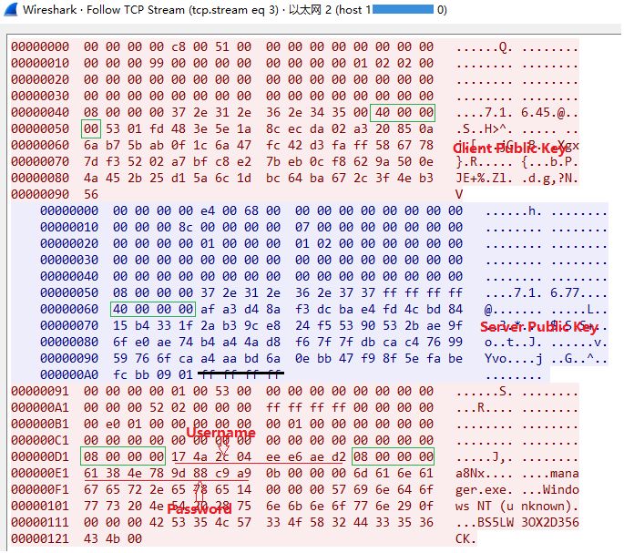 从登录的过程来看,每次会话双方都会交换公钥,然后随机生成加密密钥,这样可以确保登录账户的安全。根据Diffie-Hellman算法可知,双方公私钥的生成依赖于两个公共的参数,而这两个公共参数是可以被第三方获取到的。拿到参数的第三方可以伪装成服务器的角色监听客户端的会话请求,从而获取登录账户密码,然后再以客户端的角色利用获取的账户信息登录真正的服务器,实现中间人劫持攻击。这种方式的缺陷是通讯双方没有进行的身份认证(安华金和提交漏洞CNNVD-201901-1090)。
