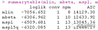 在这种情况下,根据AIC标准,由I-splines和5个分位数结点链接函数的模型提供了最佳拟合度。可以在图中比较不同的估计链接函数: