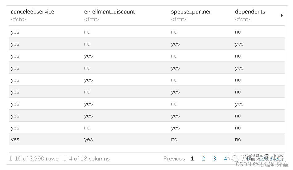 此数据框中的一行代表一家电信公司的客户。每个客户都从该公司购买了电话和互联网服务。