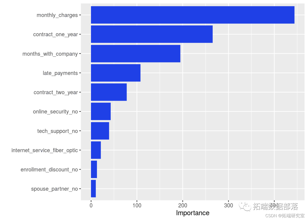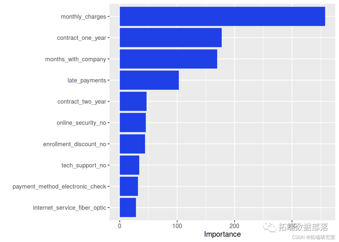 一旦我们在训练数据上训练了我们的模型,我们就可以研究变量的重要性。