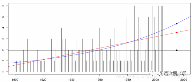 在很多情况下,泊松分布都非常适合。例如,如果我们考虑1850年后在佛罗里达州的飓风数量,