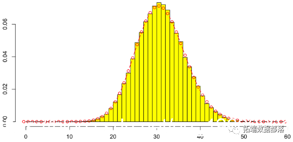 > lines(0:60-.5,dpois(0:60,lambda),type="b",col="red")