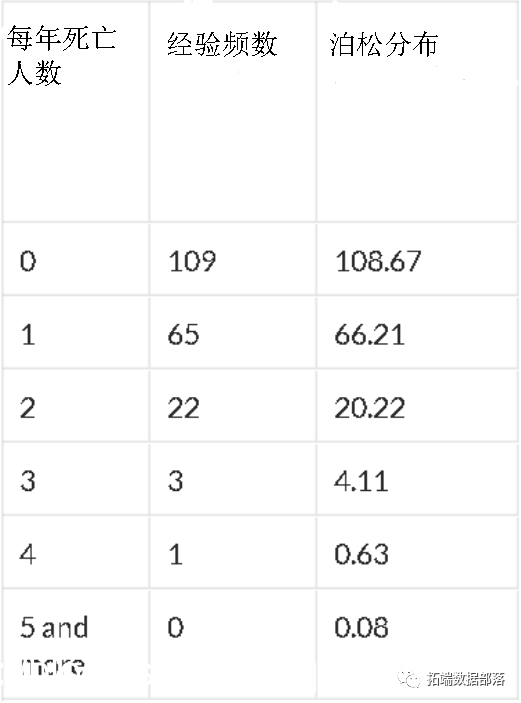 他确实获得了以下分布(此处,泊松分布的参数为0.61,即每年的平均死亡人数)