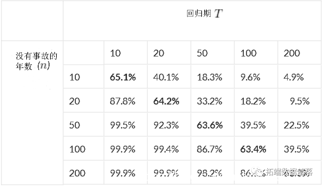 返回期是由Emil Gumbel在水文学中介绍的,用于链接概率和持续时间。十年事件的发生概率为1/10。那么10是发生之前的平均等待时间。这并不意味着该事件不会在10年之前发生,或者必须在10年之前发生。考虑一个返回期