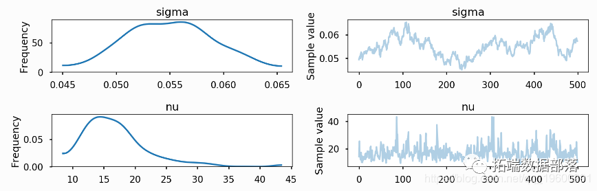 资产价格具有随时间变化的波动性(逐日收益率的方差)。在某些时期,收益率是高度变化的,而在其他时期则非常平稳。随机波动率模型用一个潜在的波动率变量来模拟这种情况,该变量被建模为随机过程。下面的模型与 No-U-Turn Sampler 论文中描述的模型相似,Hoffman (2011) p21。