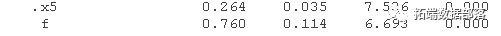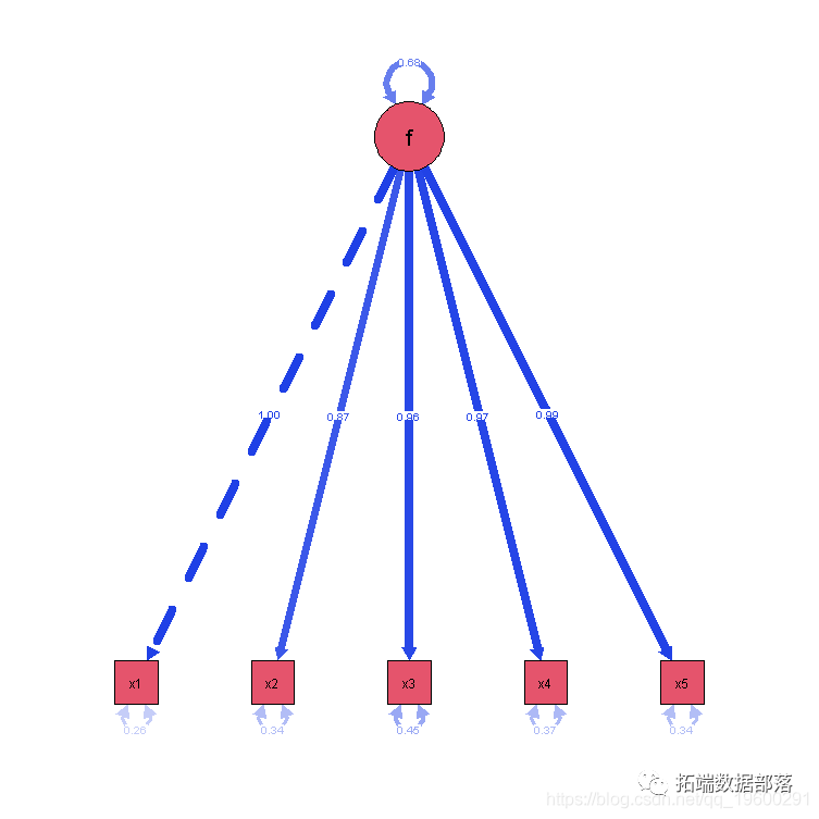 f =~ .8\*x1 + .8\*x2 + .8\*x3 + .8\*x4 + .8*x5 #定义因子f,在5个项目上的载荷。