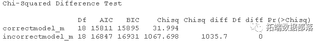 除了不正确模型的整体拟合指数较差--如CFI<0.95,RMSEA>0.06,SRMR>0.08和Chi-square test<0.05所示,正确模型也优于不正确模型,如正确模型的AIC和BIC低得多所示。