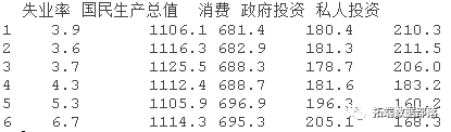 我们将使用经济序列数据。数据是一个五个季度的经济序列,包含以下数字变量:季度失业率、国民生产总值、消费、政府投资和私人投资。有161个观测点。