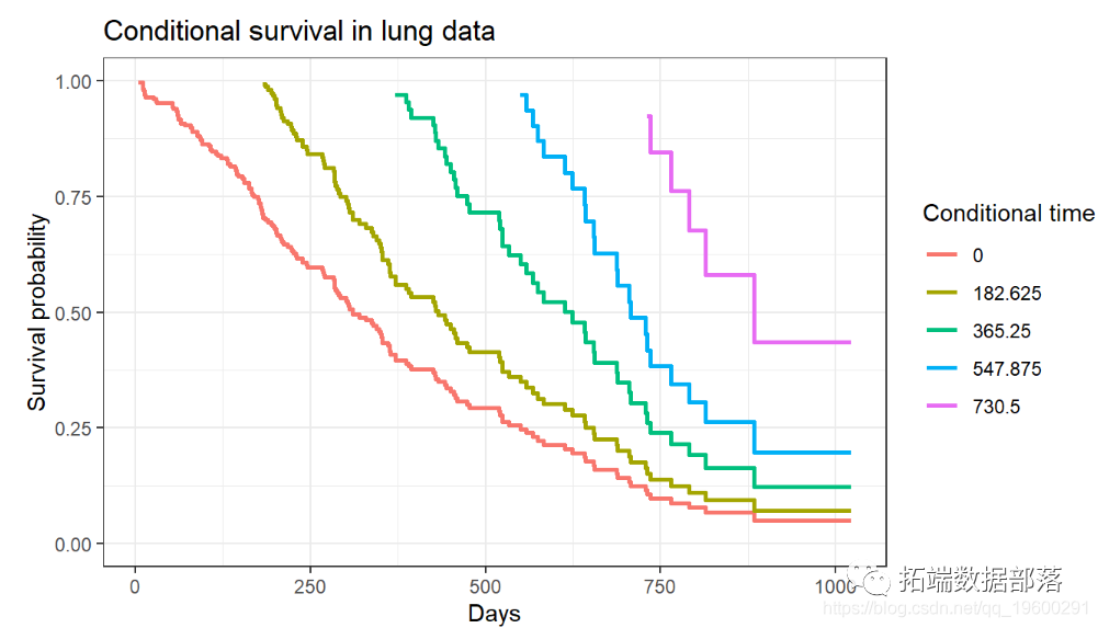在上面的图中的趋势,可以帮助我们预测在若干天结束的生存概率。