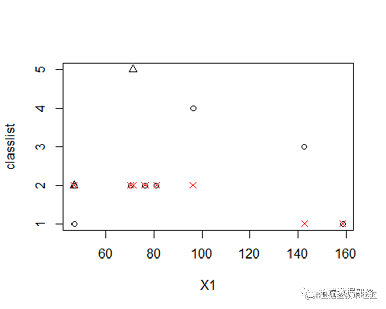 plot(textdata[,c("classlist","X1")] ,pch=ifelse(istrain==1,1,2))