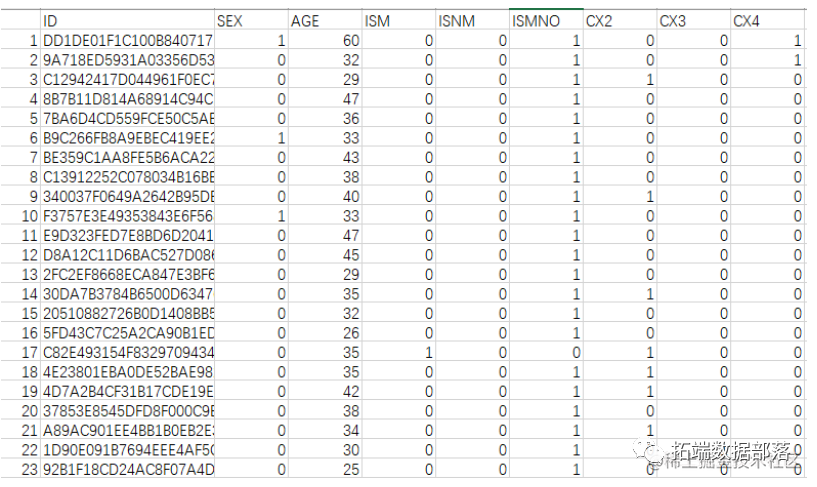 分类型变量:对每一个类别都单独提出作为一个新的虚拟变量。例如:对于“车型 1”,“车型 2”和“缺失”就分为“是否车型 1”,“是否车型 2”和“是否缺失” , 即对一个 N 分类变量划分为 N 个 2 分类变。以上例举的只是部分特征。最终得到得变量共 56 类,而后根据变量分组样本量和 IV 将变量“车主性质”(BUYERPART)和顾客 ID 给剔除,剩余 54 个变量(53个自变量)。