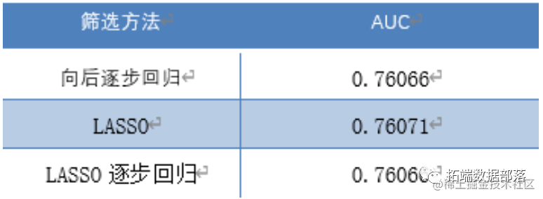 三种方法训练出来的逻辑回归模型在训练集中的AUC 值比较如下表: