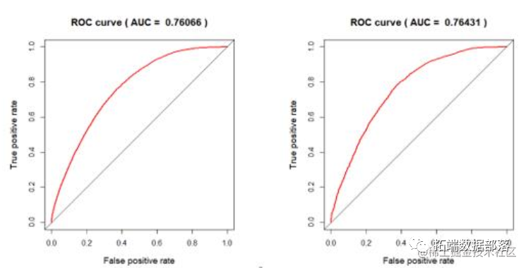 我们通过比较训练集上的 AUC 值来判别各模型预测能力的强弱。这里的 AUC(Area under the Curve of ROC)是 ROC 曲线下方的面积,是判断二分类预测模型优 劣 的 标 准 之 一 。ROC ( Receiver Operating Characteristic Curve),称为接收者操作特征曲线,其横坐标为伪阳性率(假正类率),即预测为正而实际非真的概率;纵坐标是真阳性率(真正类率),即预测为真且实际也为真的概率。