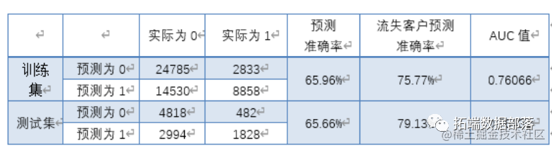 得到模型之后, 绘制出流失预测模型在训练集与测试集中的 ROC 曲线如下。根据 ROC 图中红色曲线与对角线距离最大点处对应的分割作为判别是否流失的概率阈值,计算经过基于LASSO 和逐步回归的变量筛选的逻辑回归模型在训练集和测试上预测结果的混淆矩阵见下表。其中,预测准确率定义为预测结果与实际结果一致的比例,流失客户预测准确率为在所有流失客户中被预测出为流失客户的比例。