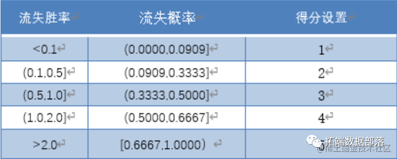由于采用一个分割点对客户进行二元分类的方法未能体现出客户流失可能性之间的差异,我们需要对客户流失倾向做进一步的区分。在逻辑回归模型的基础上,我们提出了基于流失胜率(odds)的评分机制设计, 将客户流失得分划分为 1-5 分,以此对不同得分的客户采取针对性的措施。