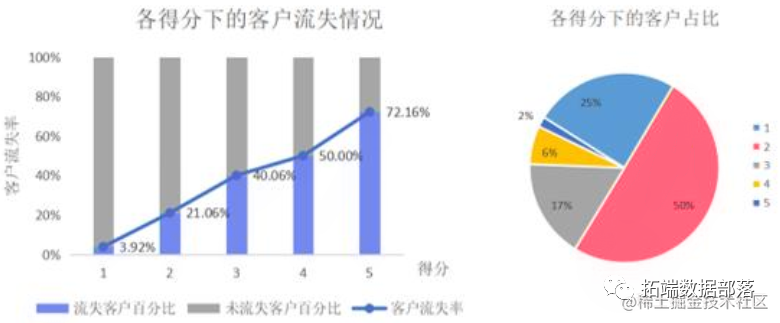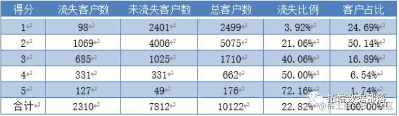 在新的得分机制下,每个得分的流失概率和客户占比较好地得到了预期的要求。根据预警得分, 4S 店的店主应该首先向占比仅 1.74%而流失比例超过 72.16%的得到 5 分预警的客户采取挽回措施,有效减少了挽回成本和对流失倾向很低的客户的打扰。其次, 4S店的店主应该关注占比6.54%的得到4分预警的客户群体,此类客户中有流失比例达到一半,若店主对客户流失现象的回避倾向较高,对 4 分客户群体采取挽回措施仍有不错的针对性。总体而言,新的得分机制设计下,更好地体现了不同预警水平下客户流失倾向的区分度,店主依据此得分报表能够更有针对性地完成流失客户识别和挽回措施的制定,预测模型基本达到了指导售后服务的要求。
