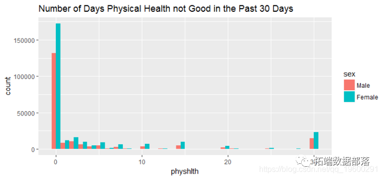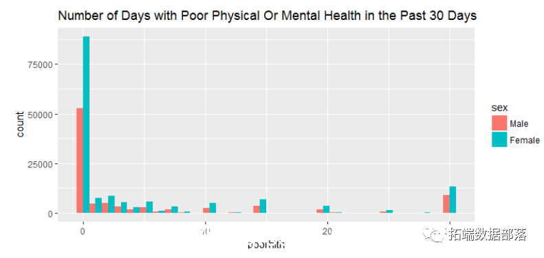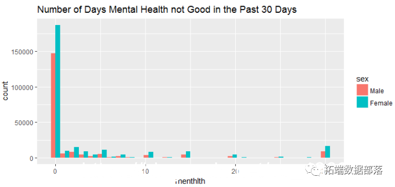 以上三个数字显示了过去30天内男性和女性对身体,精神和健康状况不佳的天数做出反应的数据分布。我们可以看到,女性受访者比男性受访者要多得多。