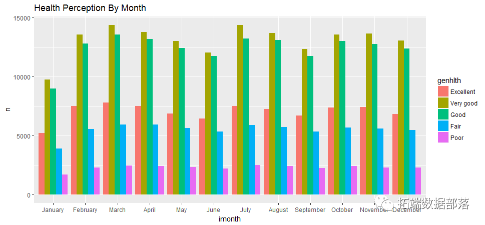 我试图找出人们在不同月份对健康状况的反应是否不同。例如,人们是否更有可能说自己在春季或夏季身体健康?