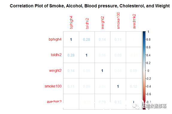 corrplot(corr.matrix, main="\n\nCorrelation Plot of Smoke, Alcohol, Blood pressure, Cholesterol, and Weight", method="number")
